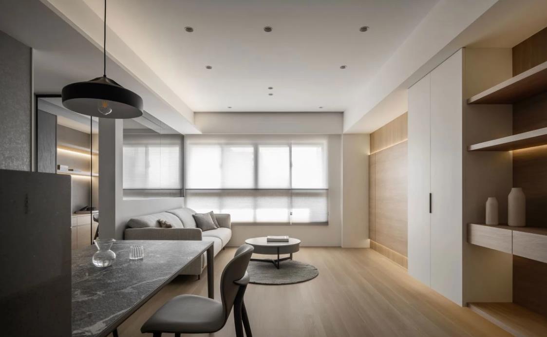 进入客厅空间,尺度宽敞的主墙面植入了展示收纳设计,透过白色系统板材与木质的交错呈现空间层次,电视主墙利用浅色木皮的堆叠缔造轻盈层次感。 整体平面化设计但拥有不同的收纳机能,凸显进门后客厅的深度,创造宽敞明亮的视觉感受。 为了对动区机能与动...