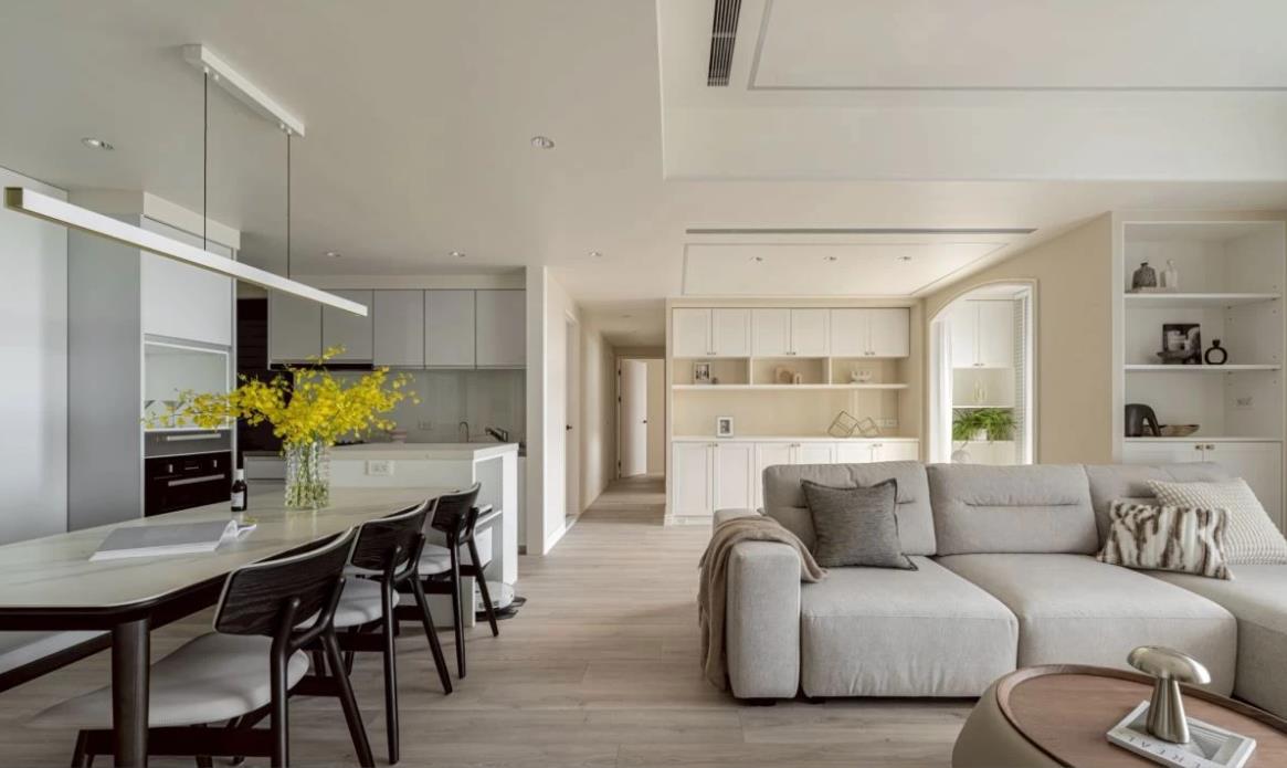 客厅位居全屋采光最佳之处,大片落地窗引入城市天际与自然光感,灰调立面与隐藏式电视柜相辅相成,在层次与利落之间取得平衡,低调却不失风格。沙发背墙结合开放展示与垂直灯光,淡雅之中藏有细节温度,展现房主对空间质感的坚持。 客餐厅采用开放式规划...